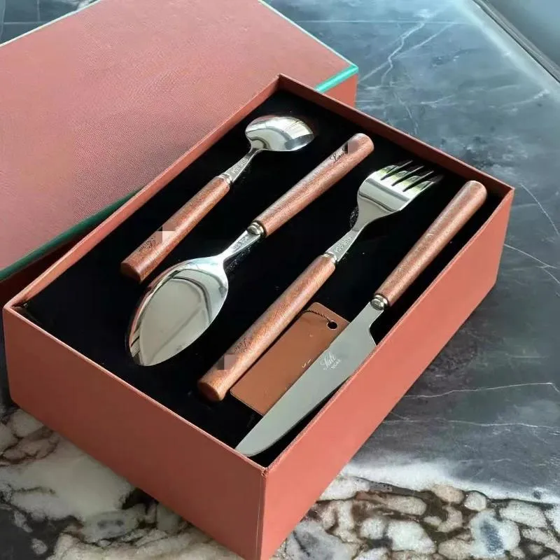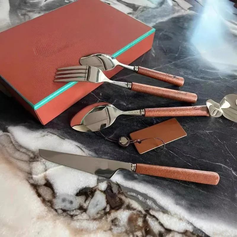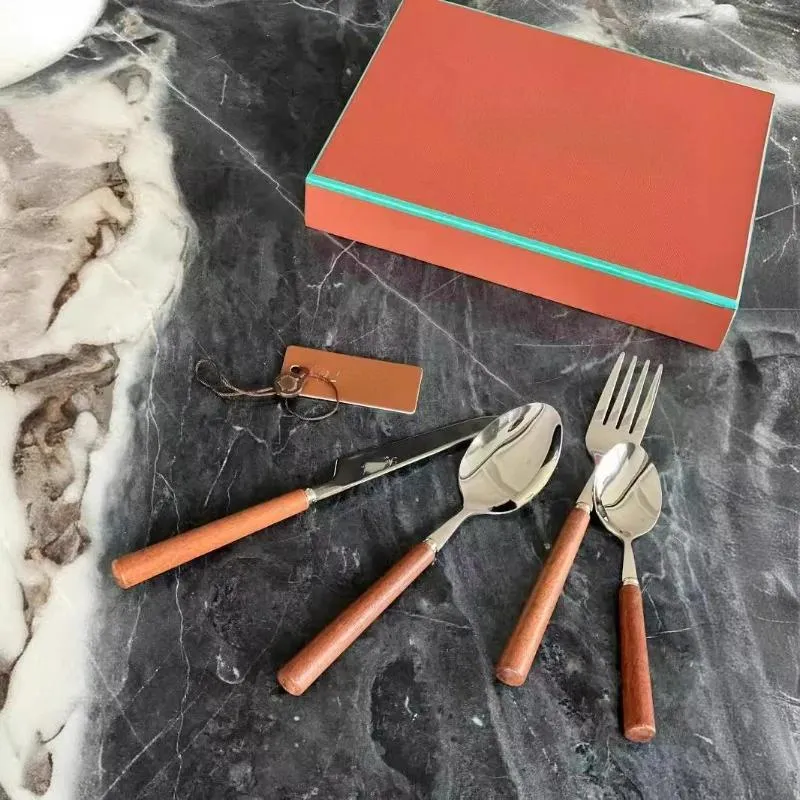 This knife fork and spoon set is a stylish, durable 4-piece Western tableware set, perfect for elevating your dining experience with its modern design and comfortable solid wood handles.