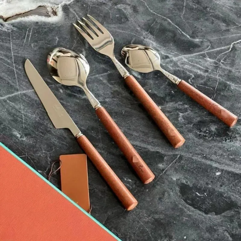 Elevate your dining experience with our 304 Stainless Steel Solid Wood Handle Knife, Fork, and Spoon set. Perfect for everyday meals or special occasions, this knife fork and spoon set adds a touch of rustic elegance to any table setting.