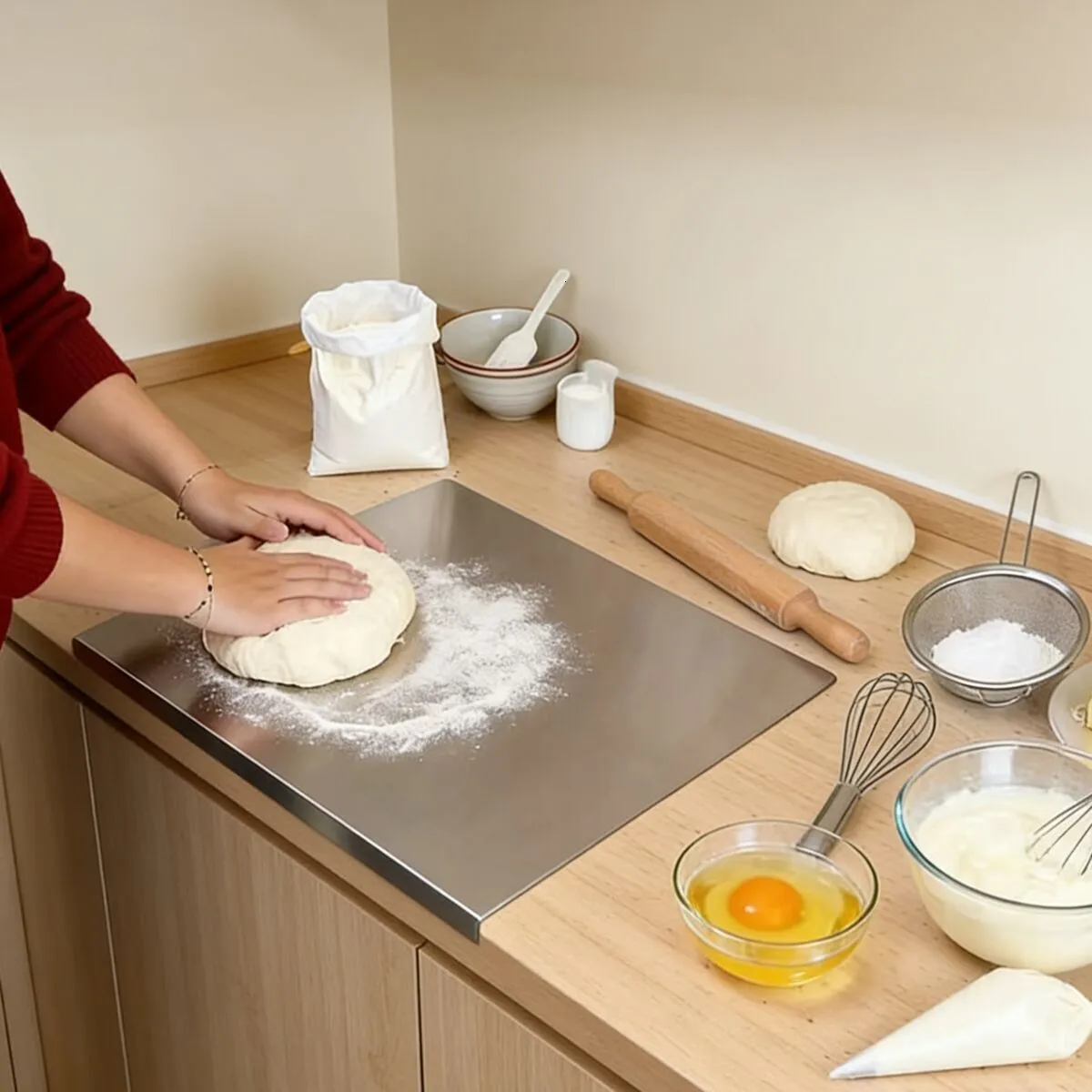 Aqro's Stainless Steel Cutting Board boasts an innovative design featuring edges designed specifically to capture excess flour during kneading processes, ensuring cleaner workspaces while saving you time.