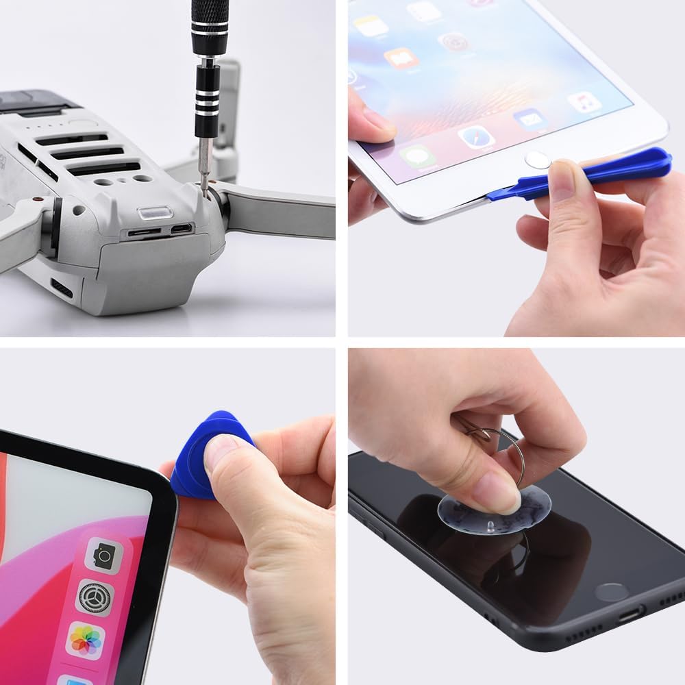 - 6- Package List: 28x Screwdriver bits, 1x handle, 1x Scalable Connecting Rod, 1x Suction, 1x SIM Card Pin, 1xTweezers, 1x Square Crowbar, 1x Round Crowbar, 1x Opening Pick (Drone and other items NOT included!!!)