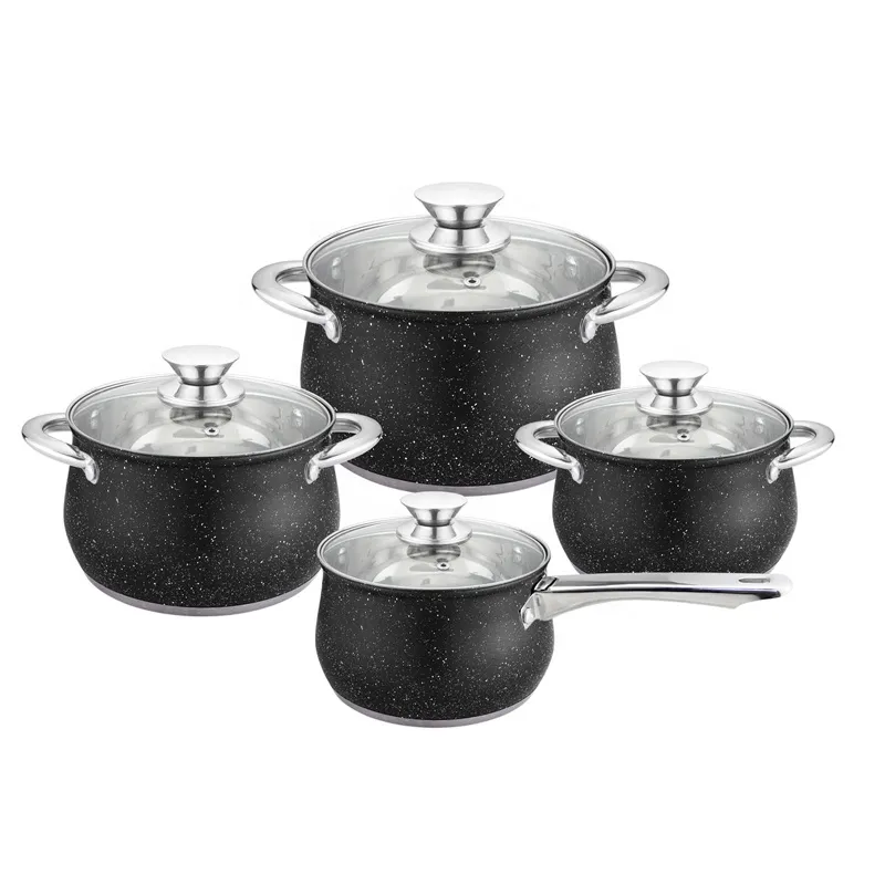 Multi colored cookware set is a complete 8-piece collection of durable, non-stick stainless steel pots and pans, offering vibrant style and essential tools for everyday cooking adventures.