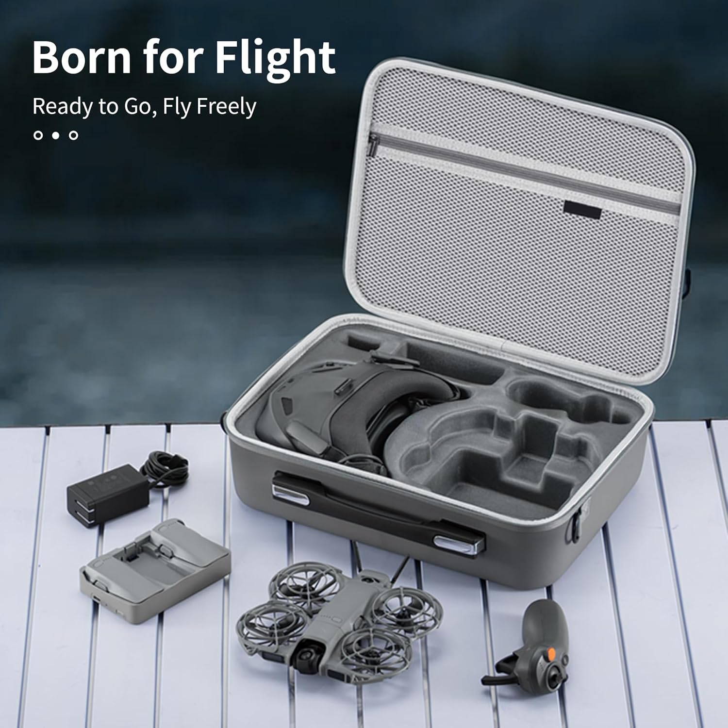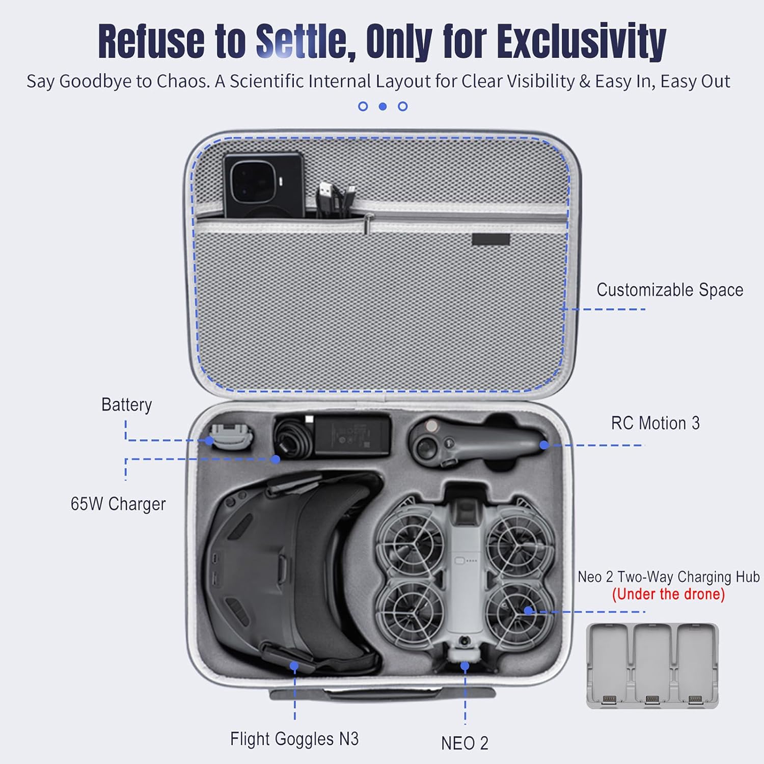 DESIGNED FOR DJI Neo 2 Motion Fly More Combo: The NEO2 Case provides a custom-fit storage solution for DJI Neo 2 drone, Goggles N3, RC Motion 3 Controller, Two-Way Charging Hub, Batteries, 65W Portable Charger. The included net pocket conveniently stores cables, SD cards, filter set, propellers and other small accessories. 1:1 precise design of the inner compartment keep everything securely in place