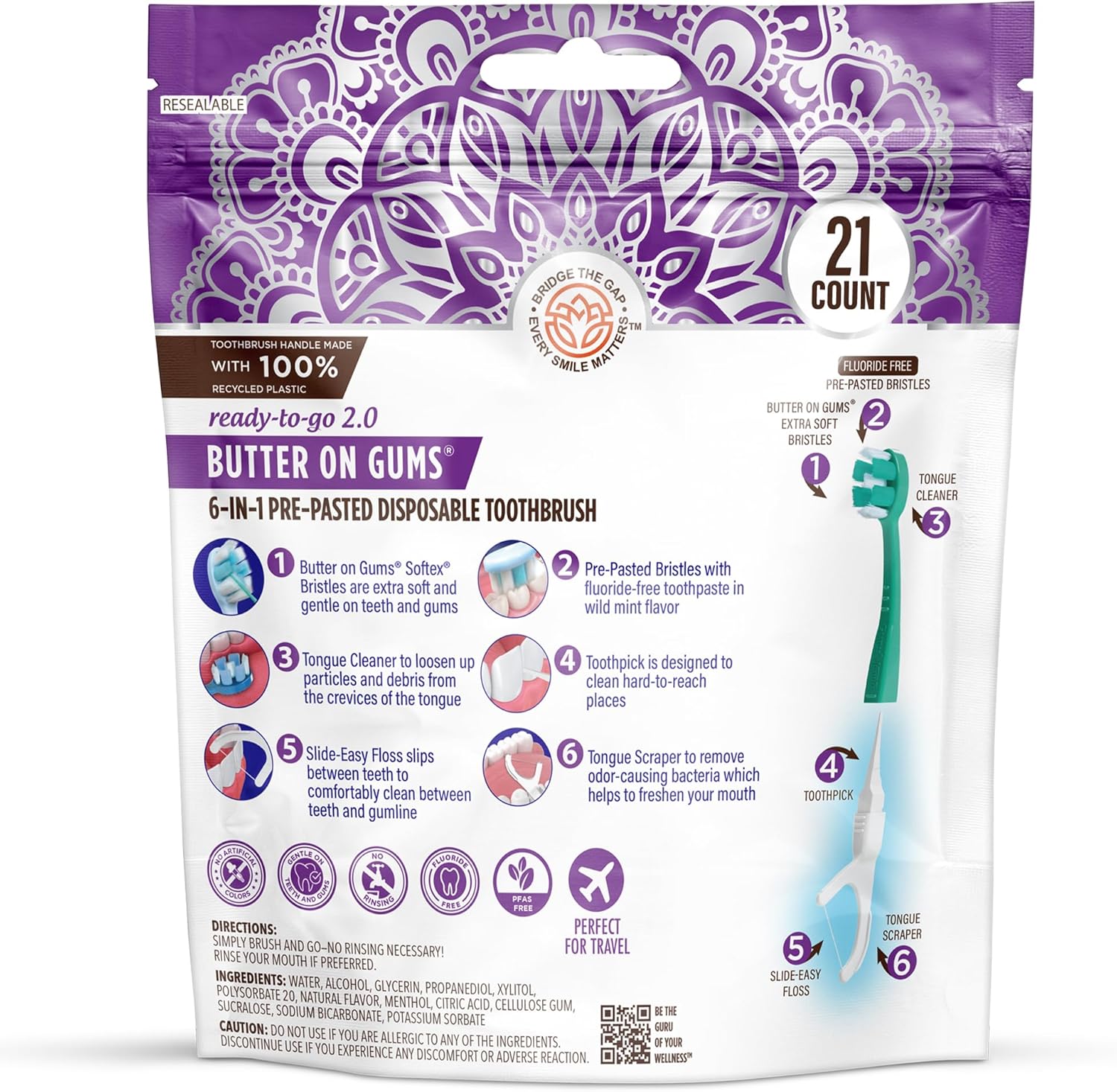 ALL-IN-ONE ORAL CARE: Your on-the-go smile solution! This 6-in-1 disposable toothbrush features extra-soft Softex bristles, prepasted fluoride-free toothpaste, a single-line floss thread, detachable toothpick & a built-in tongue & cheek cleaner—everything you need for a complete clean anywhere.