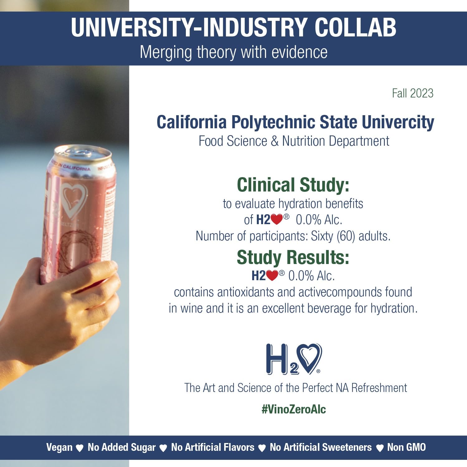 - H2o (pronounced H-two-oh) – Silky and citrus-forward, this Sauvignon Blanc–inspired 0.0% alcohol refreshment is made with California Sauvignon Blanc.