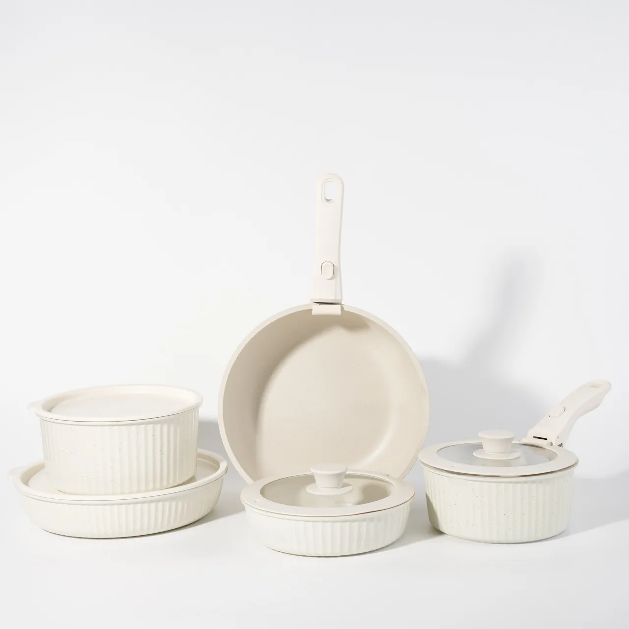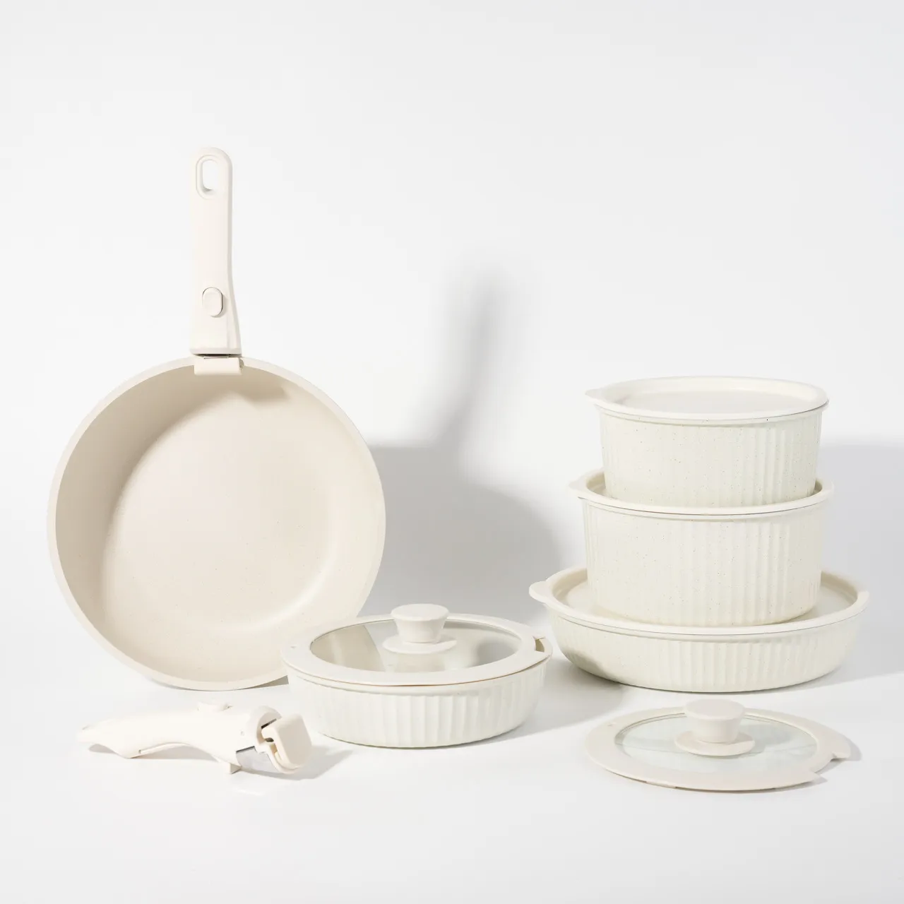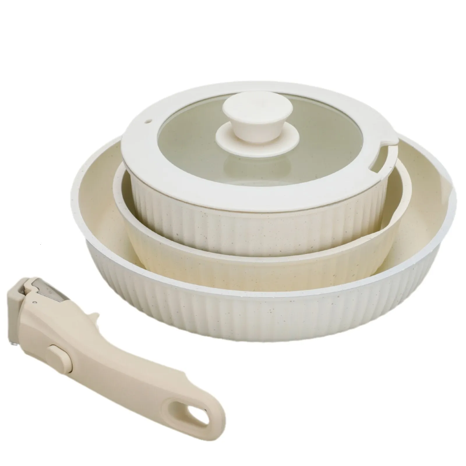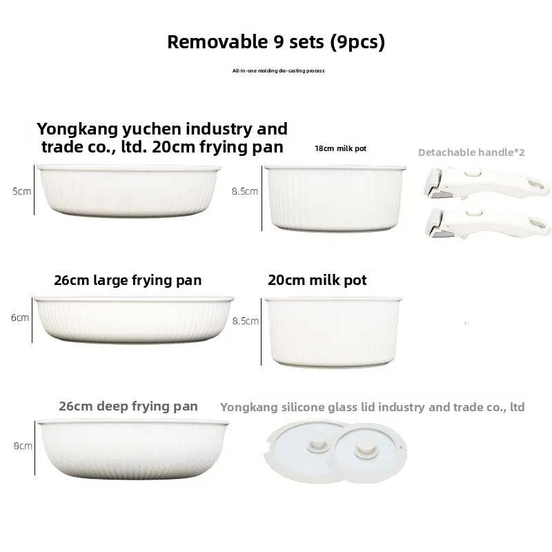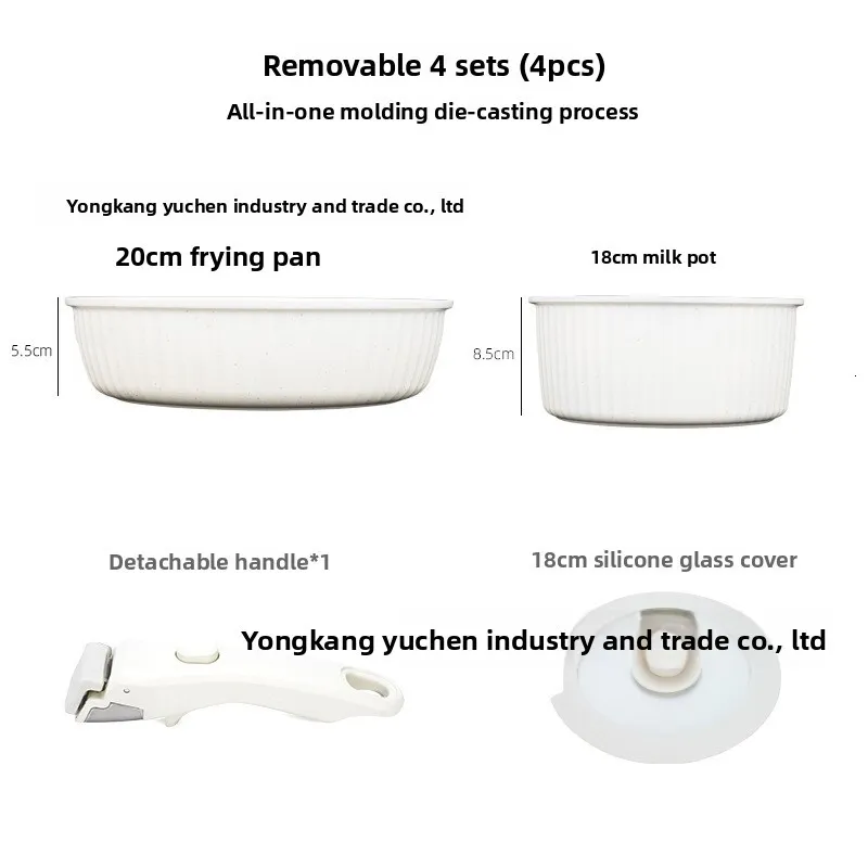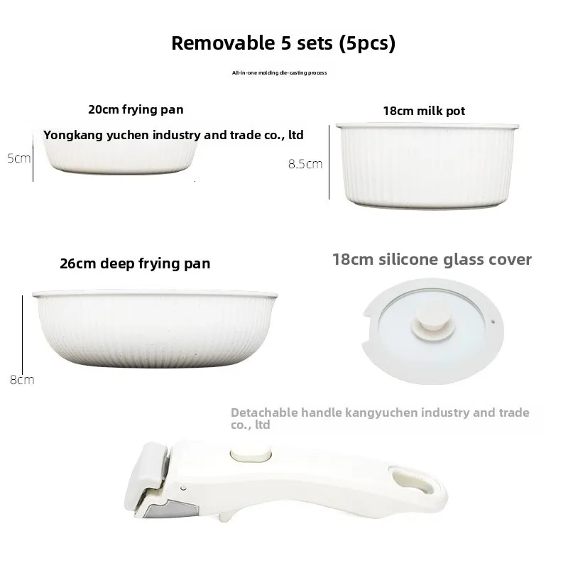 This Household Detachable Handle Cookware 16-Piece Non-Stick Pan Combination Pot Set 5-Piece features removable handle pan set, offering space-saving storage and effortless transitions from stovetop to oven to table.