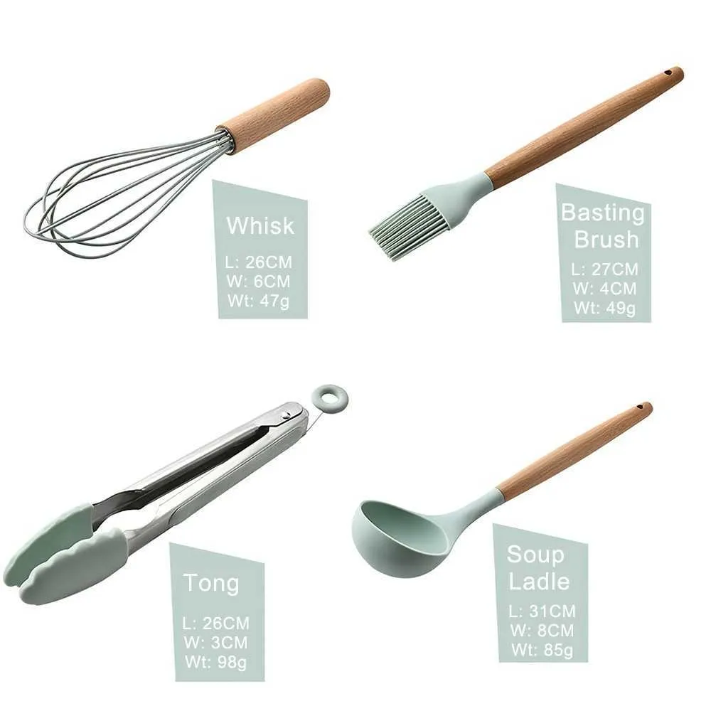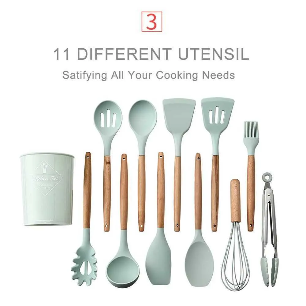 Premium 11 pieces silicone kitchen cooking utensil set with wooden holder. The ultimate silicone kitchenware set that has everything you need to make great and delicious meals. They are great gift fo