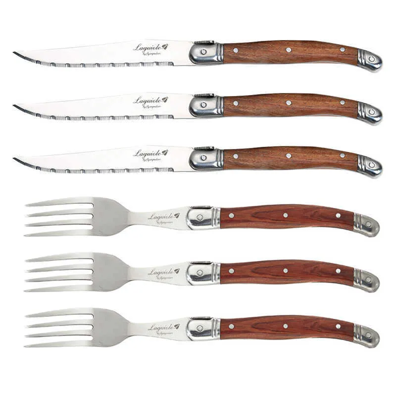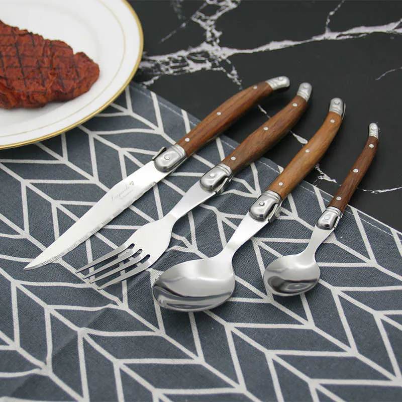 6pcs Wood Handles Japanese Dinnerware set Laguiole Style Steak Knives Forks Dinner Spoon Mini Coffee Teaspoon Restaurant Bar