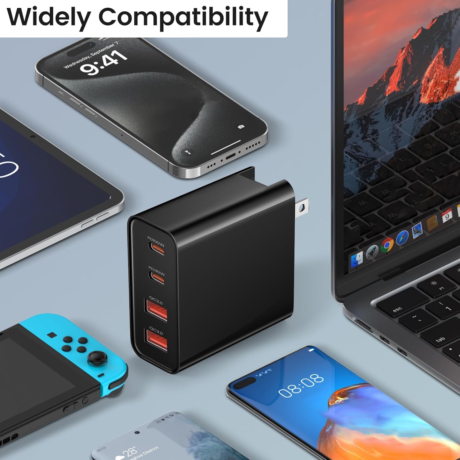 - Black ABS wall charger, supports PD 100w, 65w and 30w fast-charging; Built-in smart IC chip-set to prevent short circuit, with over voltage and current protection