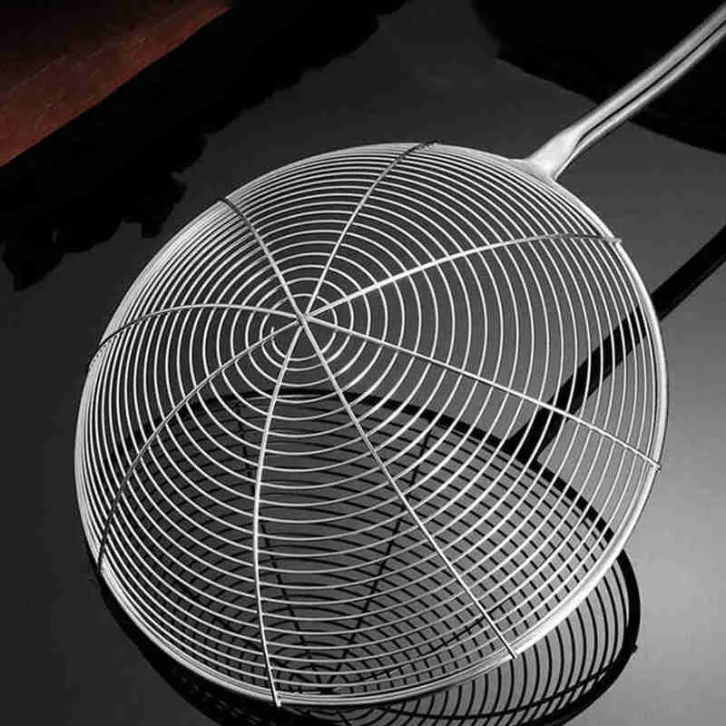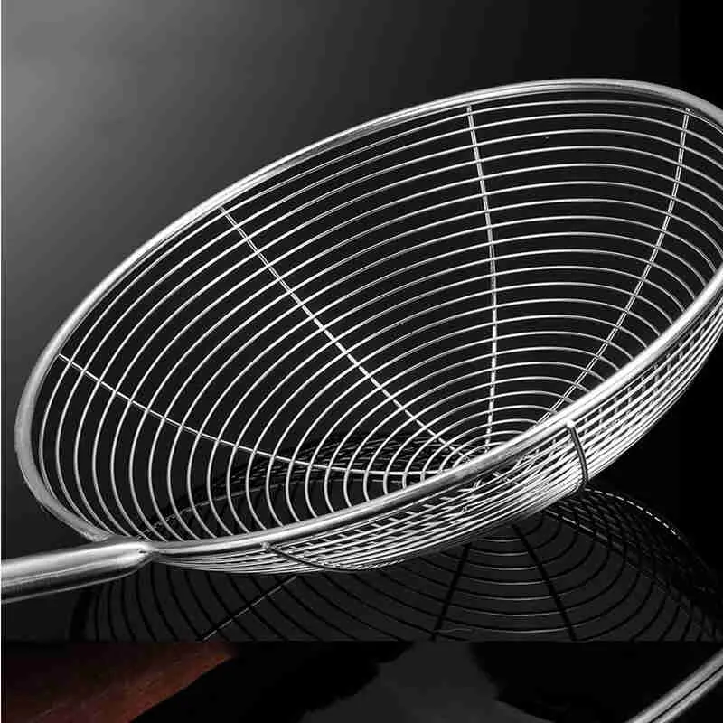 Sturdy Spider Mesh Design: This strainer's fine 304 stainless steel mesh efficiently drains liquids while retaining even small food particles, ideal for straining pasta, vegetables, or frying foods during busy weeknight dinners or tailgate parties.