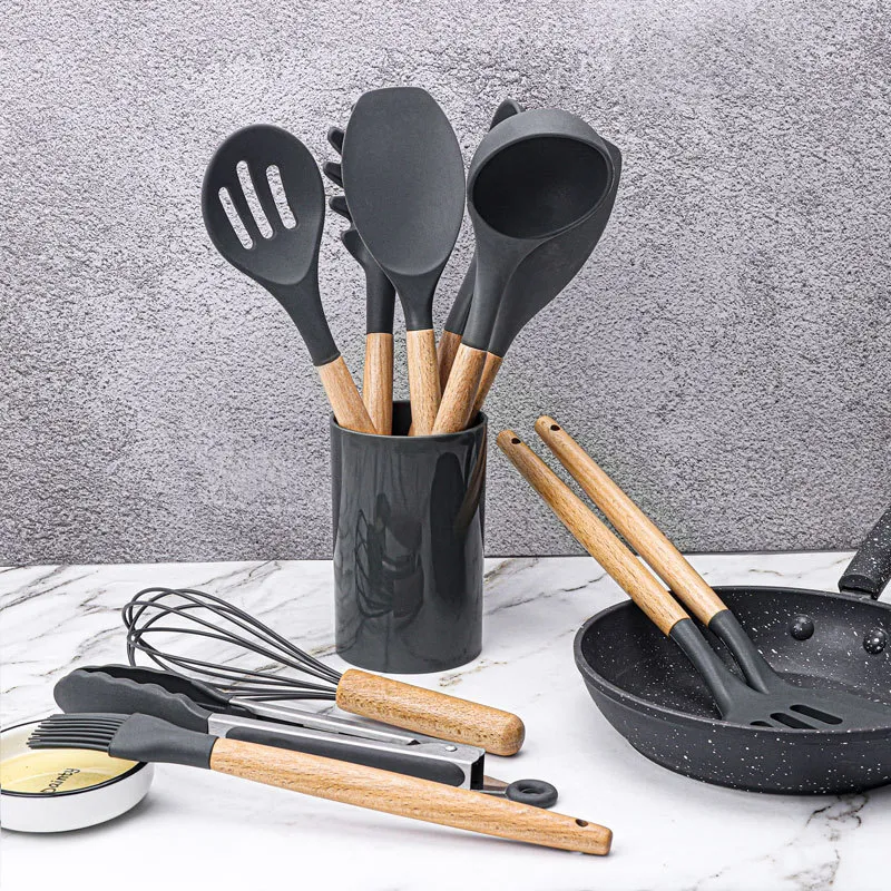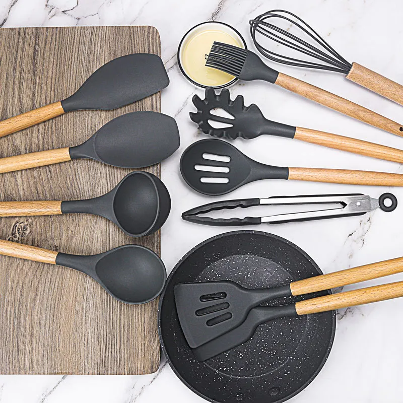 This silicone utensils set features a variety of essential tools, including a spatula, spoon, ladle, and egg beaters, making it a comprehensive addition to any kitchen and making cooking easier.