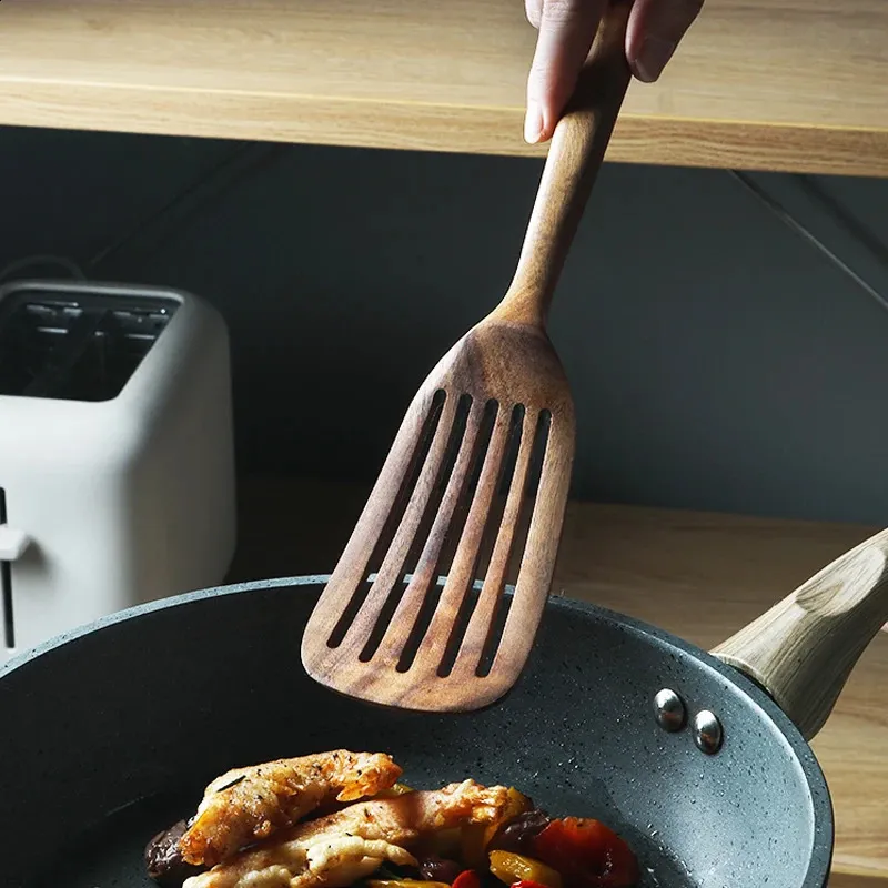 • Wooden Kitchen Spatula - This kitchen spatula is designed to gently stir and flip food in non-stick pans without scratching surfaces, preserving cookware longevity while providing smooth cooking and serving experience in everyday American kitchens.
